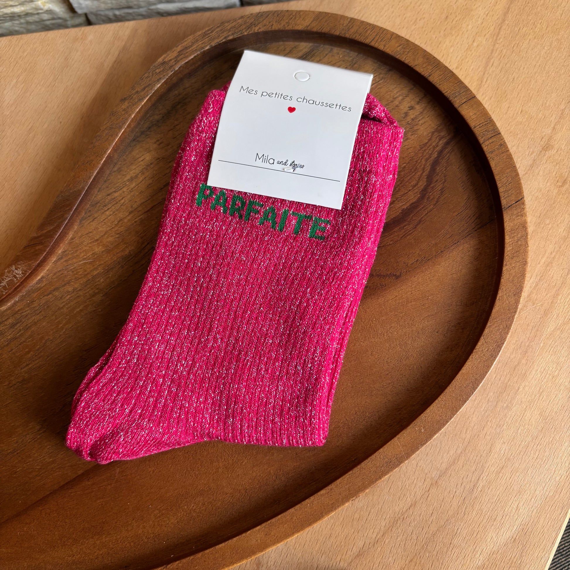 Ajoutez une touche de fun et de glamour à vos tenues avec nos chaussettes à paillettes ! Avec le mot “Parfaite” écrit dessus, elles ne passent pas inaperçues et affirment votre style avec humour et audace. Douces, confortables et scintillantes, elles sont idéales pour briller même dans les journées les plus ordinaires.