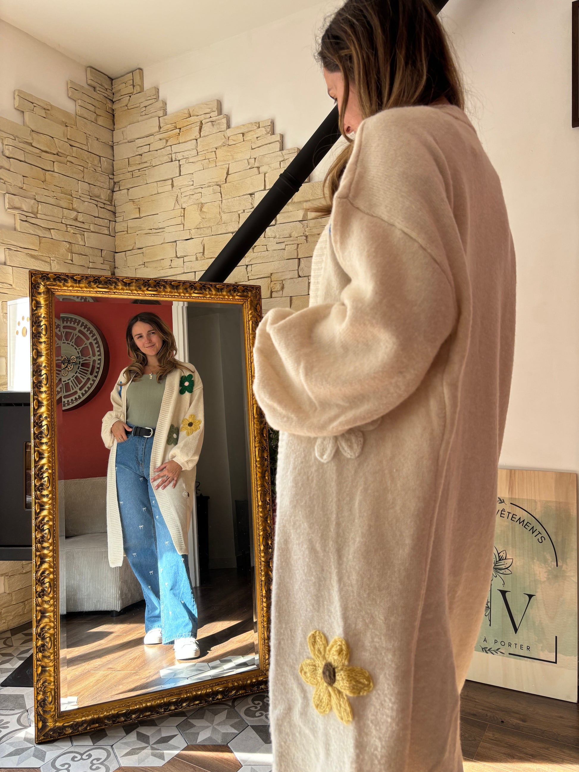 Le Gilet Floral Long est la pièce cosy et tendance qui apporte une touche de fraîcheur à votre dressing 🌼. Confectionné dans une maille douce et chaude, il se distingue par ses motifs marguerites multicolores tricotés directement dans le tissu, pour un rendu unique et plein de charme.